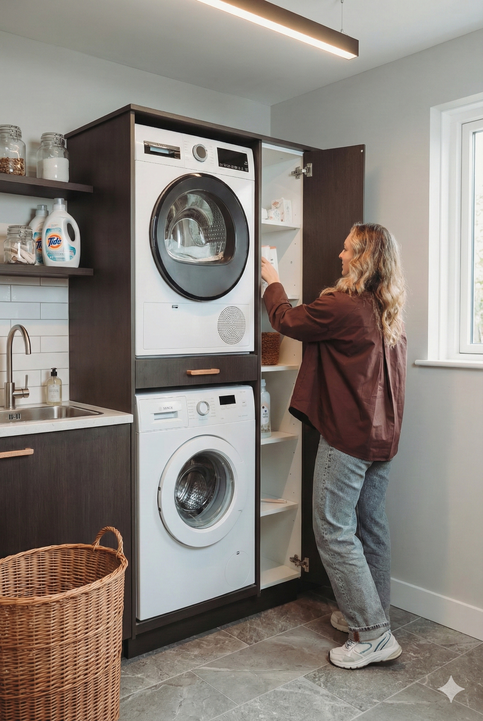 Pak even je rolmaat. Meet de breedte, hoogte en diepte van jouw wasruimte. Dan weten we zeker dat jouw wasmachinekast straks perfect past — zonder gedoe achteraf.