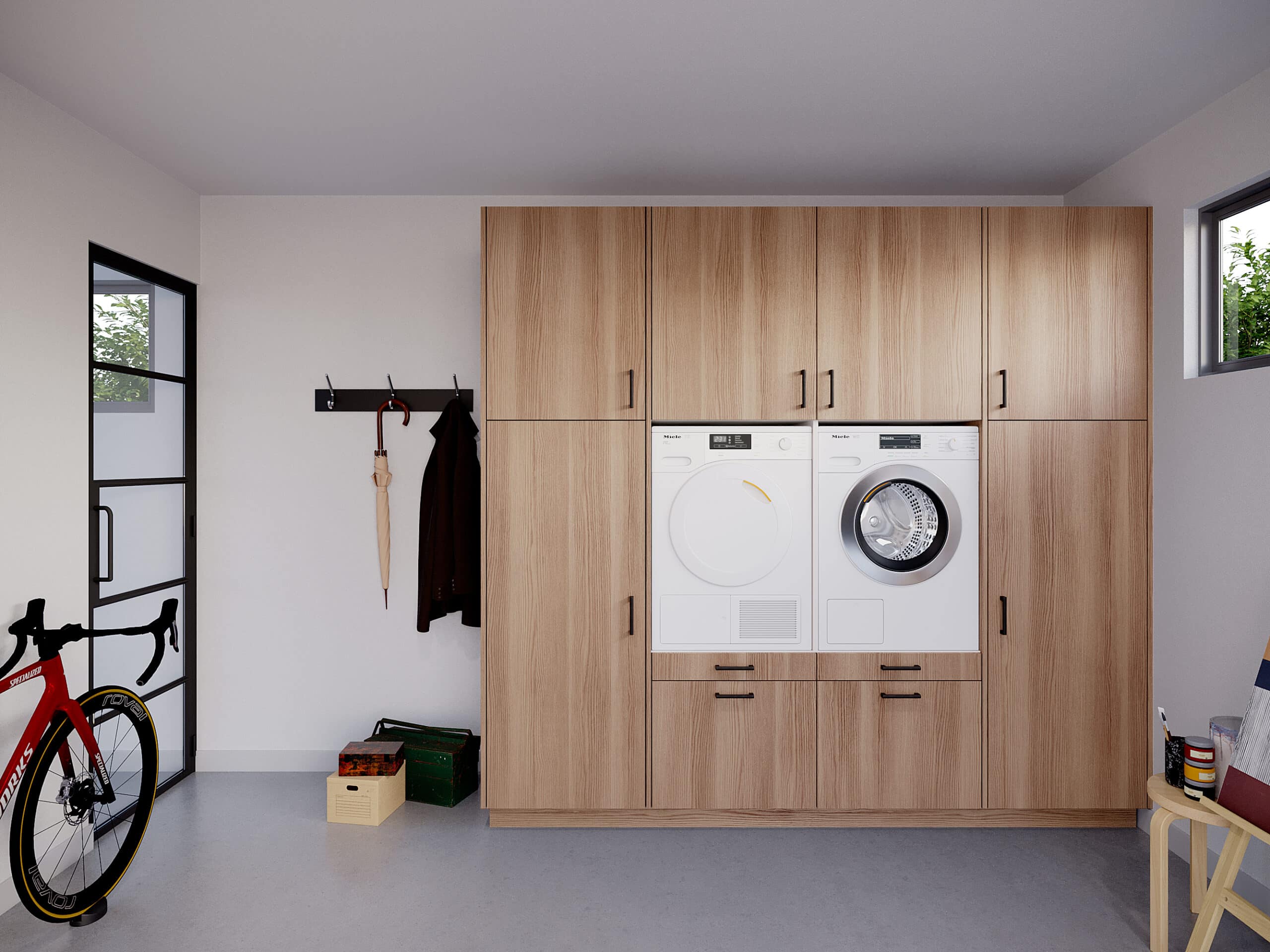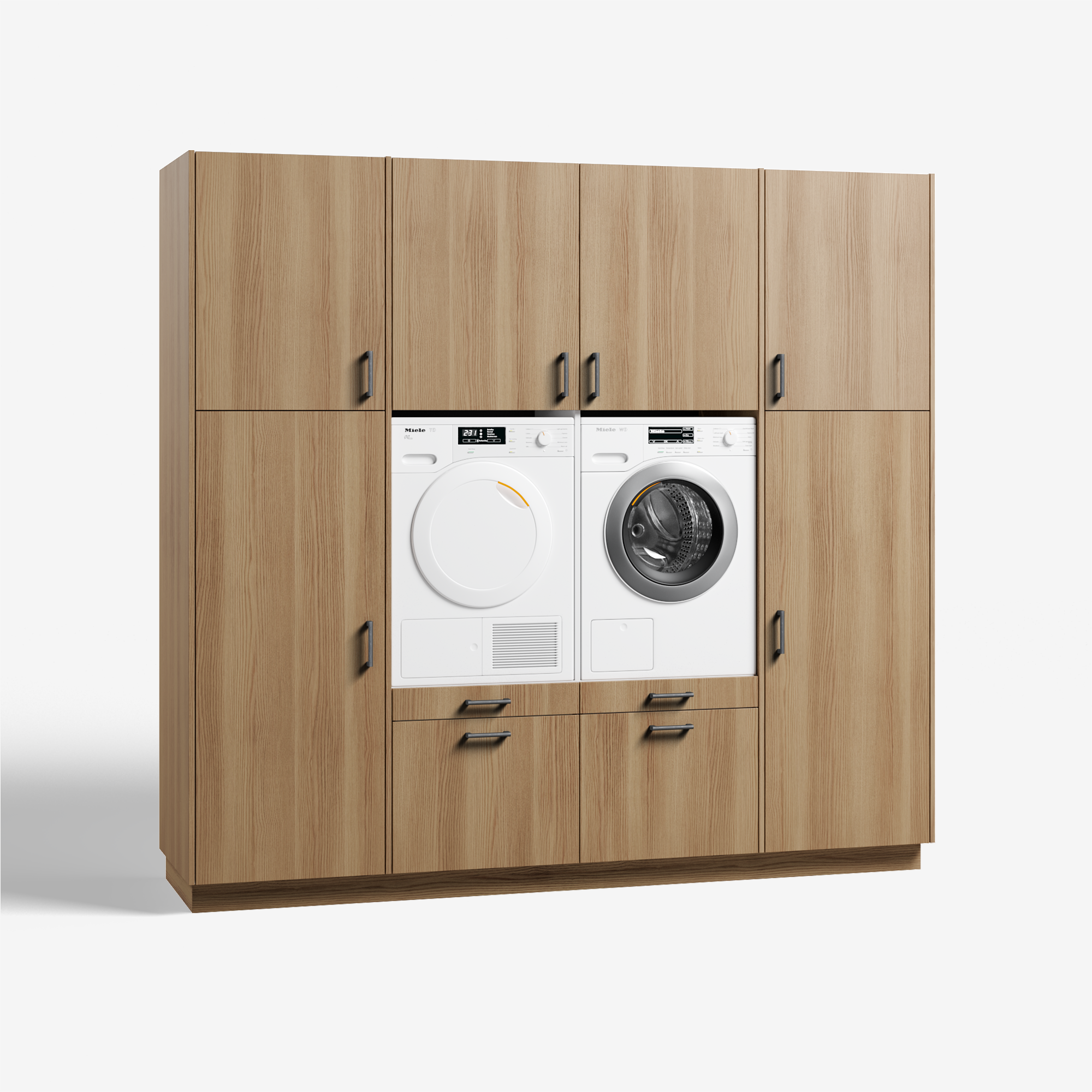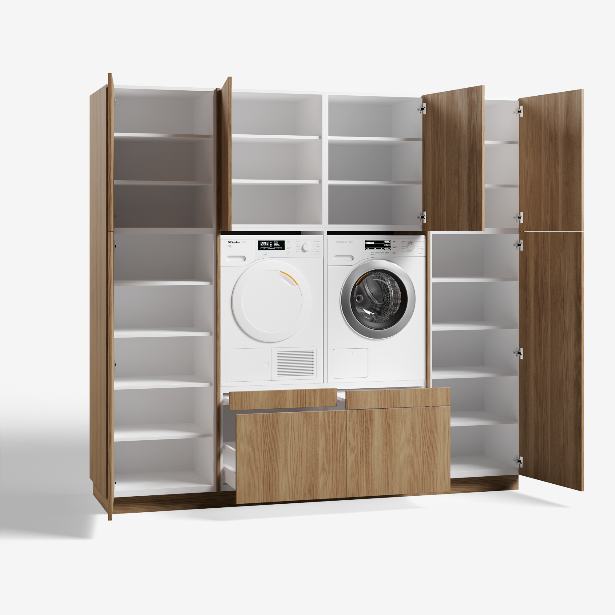 Wasmachinekast Full House is een bijkeuken in de vorm van een design kast. In het midden zijn je was- en droogautomaat op ergonomische hoogte precies op hun plek. Met daaronder twee soft close uitrek plateaus voor bijvoorbeeld je wasmand. De box lades daar onder zijn volledig te openen, ook zo rustig en geruisloos dankzij soft close. Links en rechts van je wasautomaten vind je een hoge kast van bijna 1,50 m hoog, met vier verstelbare schappen. Ook passen hier zowel de Liebherr koelkast als de Liebherr vriezer in, die je los kunt bijbestellen. Deze installeren we bovendien ter plekke samen met de wasapparatuur wanneer je kiest voor ‘inclusief montage’. De bovenzijde van de Full House bestaat uit vier ruime bovenkasten met ieder twee verstelbare schappen. Met de verborgen stelpoten ben je ervan verzekerd dat jouw Full House altijd waterpas staat. En achter de demontabele plint zijn losse snoeren verleden tijd. Meer wasgemak bergruimte, klasse en kwaliteit vind je in geen enkel andere design wasmachinekast. Kies zelf de stijl van je handgrepen. Op elke wasmachinekast, standaardmodel of maatwerk, heb je 5 jaar volledige garantie. Met deze service is de robuuste kwaliteit van Full House gegarandeerd. Zelf monteren kan, we leveren je wasmachine meubel in kant en klare delen voor jouw klusgemak. Kies je voor ‘inclusief montage’, dan bezorgen wij jouw wasmeubel en monteren onze servicemedewerkers de kast en installeren alle apparatuur op locatie.