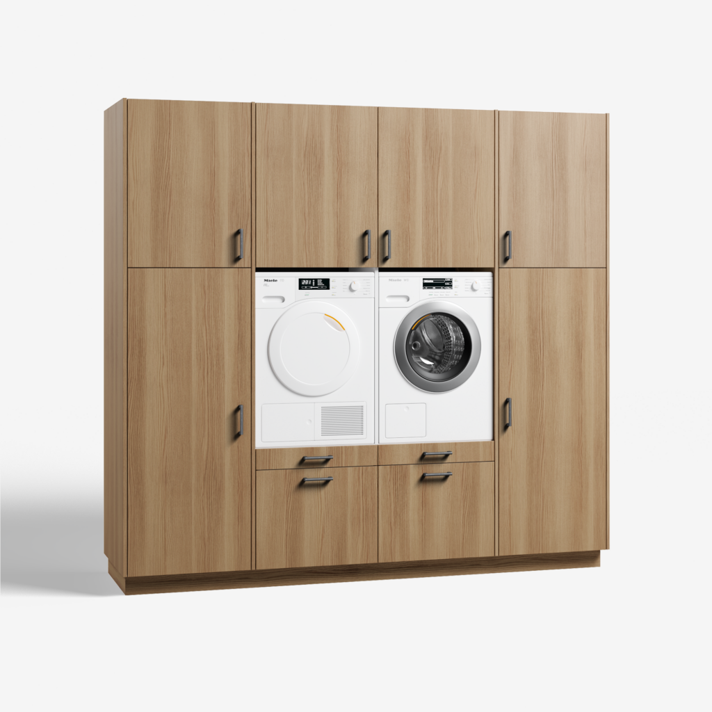 Maximaal wasgemak in een stijlvol jasje? Dat is precies wat de wasmachinekast Straddle XL biedt. Dit stevige en elegante meubel is ontworpen om je wasmachine en droger veilig bovenop elkaar te plaatsen. Met de extra kastruimte boven je machines en de smalle, hoge kast van 2,35 meter links ernaast, heb je ook XL opbergruimte. Dankzij het praktische uitschuifplateau tussen beide apparaten heb je altijd een handige plek voor je wasmand, om wasgoed te vouwen of je wasmiddel neer te zetten. Na het vullen van de wasmachine berg je alles eenvoudig op in het bovenkastje. Zo blijft je wasruimte netjes en georganiseerd! Met een compacte breedte van 97,3 cm past de Straddle XL moeiteloos in vrijwel elke ruimte. Of het nu de bijkeuken, badkamer, keuken of schuur is, dit meubel past naadloos in jouw interieur. Kies jouw favoriete kleur en handgreep, zodat Straddle XL perfect aansluit bij jouw woonstijl. Wasmachinekast Straddle XL is gemaakt van hoogwaardig gecertificeerd materiaal dat vochtwerend, geluidsabsorberend, trilarm en robuust is. Wasmachinekast.nl biedt op alle modellen – standaard of maatwerk – 5 jaar volledige garantie. Duurzame kwaliteit gegarandeerd! De kast wordt in handzame delen aan huis geleverd, zodat je jouw wasmachinekast eenvoudig zelf kunt monteren. Liever nog meer gemak? Kies dan voor de optie ‘inclusief montage’. Onze monteurs installeren je kast op locatie en maken je wasmachine en droger direct gebruiksklaar. Straddle XL, de hogere variant van onze Straddle wasmachinekast, een van de standaardmodellen uit onze One Pair familie. Op zoek naar een oplossing op maat? Klik dan hier voor alle mogelijkheden!