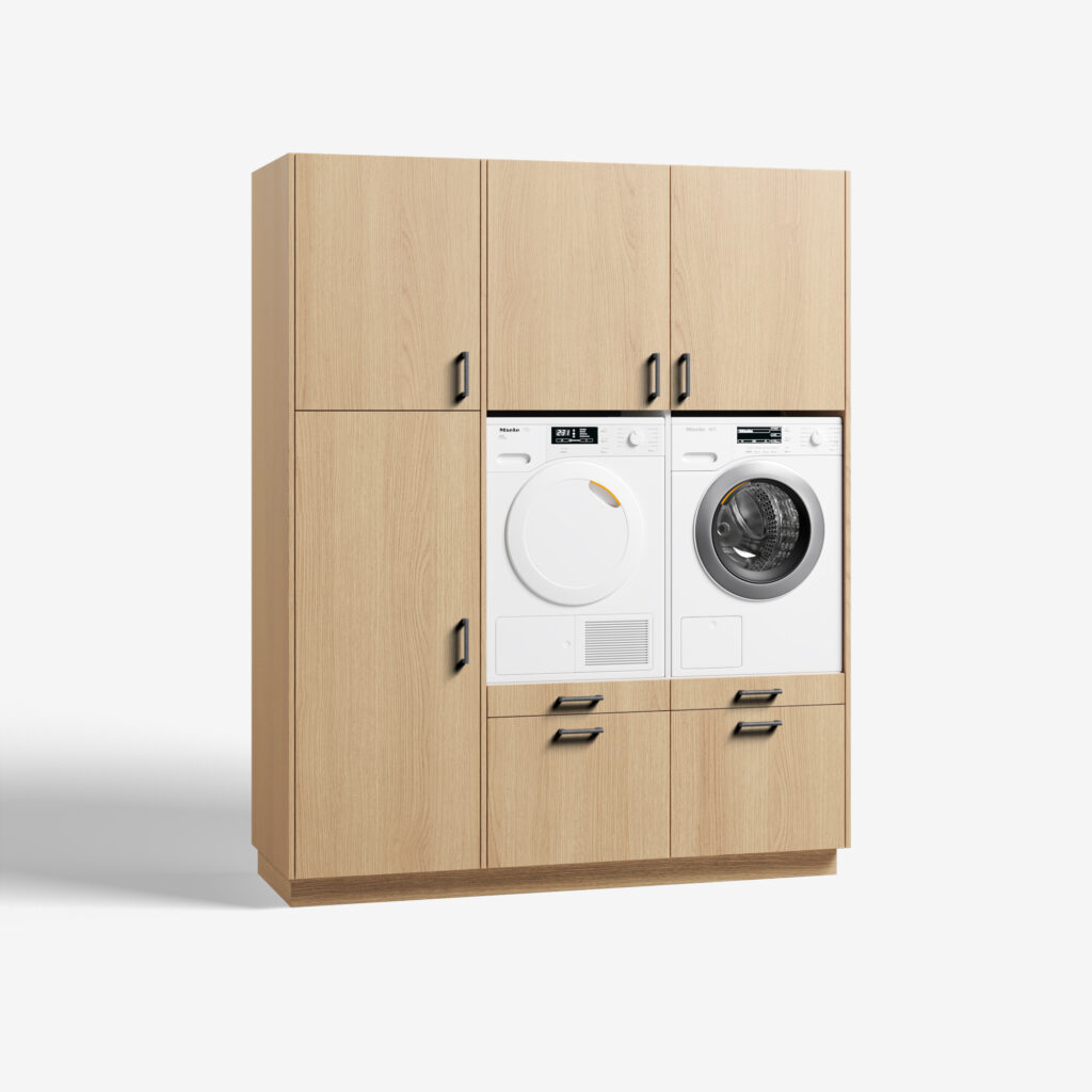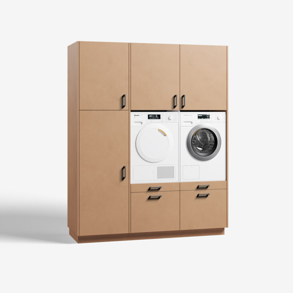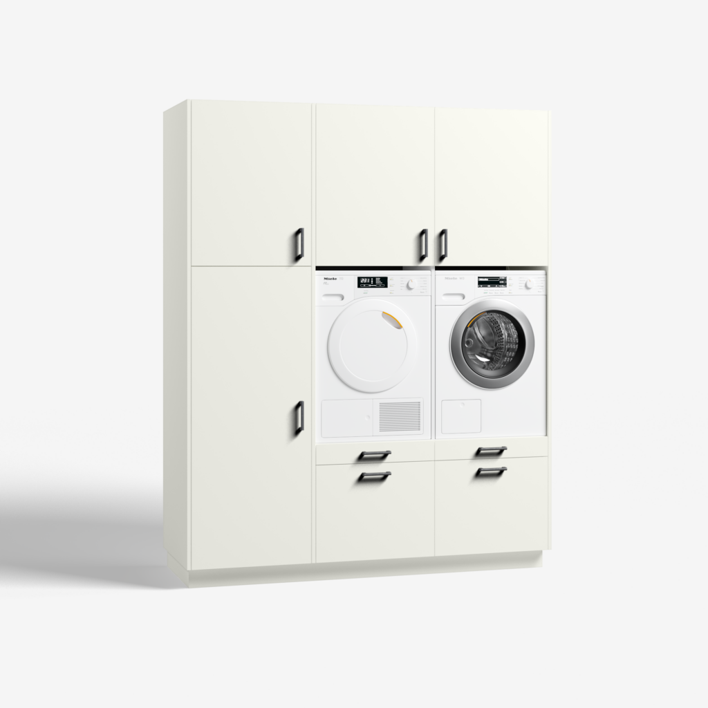 Met het model Three of a Kind win je bijzonder veel ruimte. Ook als de grootte van het vertrek waarin je de wasmachinekast plaats, beperkt is. Met z’n 1,90 meter is de kast geschikt voor op een bescheiden plek. Toch is Three of a Kind groot genoeg voor maar liefst drie apparaten. De kast heeft namelijk twee open ruimtes voor je droog- en wasmachine. Rechts daarvan zit een hoge kast. Gebruik deze als flexibele bergruimte, bezemkast of als plek voor een (extra) koelkast of vriezer. Wat een gemak. De Three of a Kind biedt je drie keuzes: 1) jouw gewenst kleur, 2) jouw eigen stijl handgrepen en 3) koelkast of bergruimte. Ga je voor de koelkast, dan kunnen we je een Liebherr koelkast of Liebherr vriezer leveren. Deze apparatuur bouwen we in en installeren wanneer jij jouw bestelling door de monteurs van wasmachinekast.nl thuis laat plaatsen. Wil je naast de twee ruime soft close lades en de praktische uitrek plateaus de hoge kast als bergruimte benutten? De kast is standaard voorzien van vier verstelbare schappen. De verstelbare poten zetten je wasmachinekast gegarandeerd waterpas en achter de demontabele plint, verdwijnen alle snoeren en aansluitingen keurig uit het zicht. Wasmachinekast.nl biedt op elke wasmachinekast, standaardmodel of maatwerk, vijf jaar volledige garantie. Van je Three of a Kind zijn de kwaliteit en service langdurig gegarandeerd. Kies jij voor zelf monteren, dan wordt je wasmachine meubel in praktische delen aan huis geleverd en zet je het model zelf eenvoudig in elkaar. Kies je voor ‘inclusief montage’ dan bezorgen wij jouw wasmeubel aan huis en monteren onze servicemedewerkers tegen meerprijs de kast op locatie, inclusief installatie van de wasmachine, droger en de Liebherr koelkast of vriezer in de ruime Three of a Kind. Three of a Kind heeft ook een linkshandige opstelling: wasmeubel Big blind.