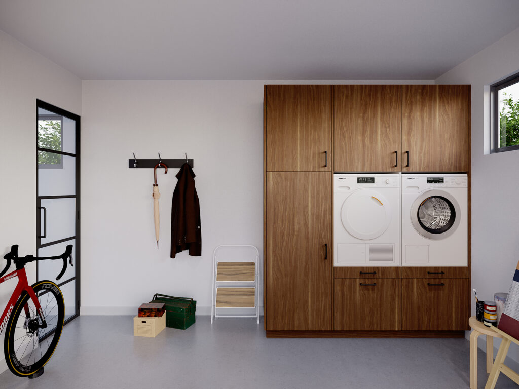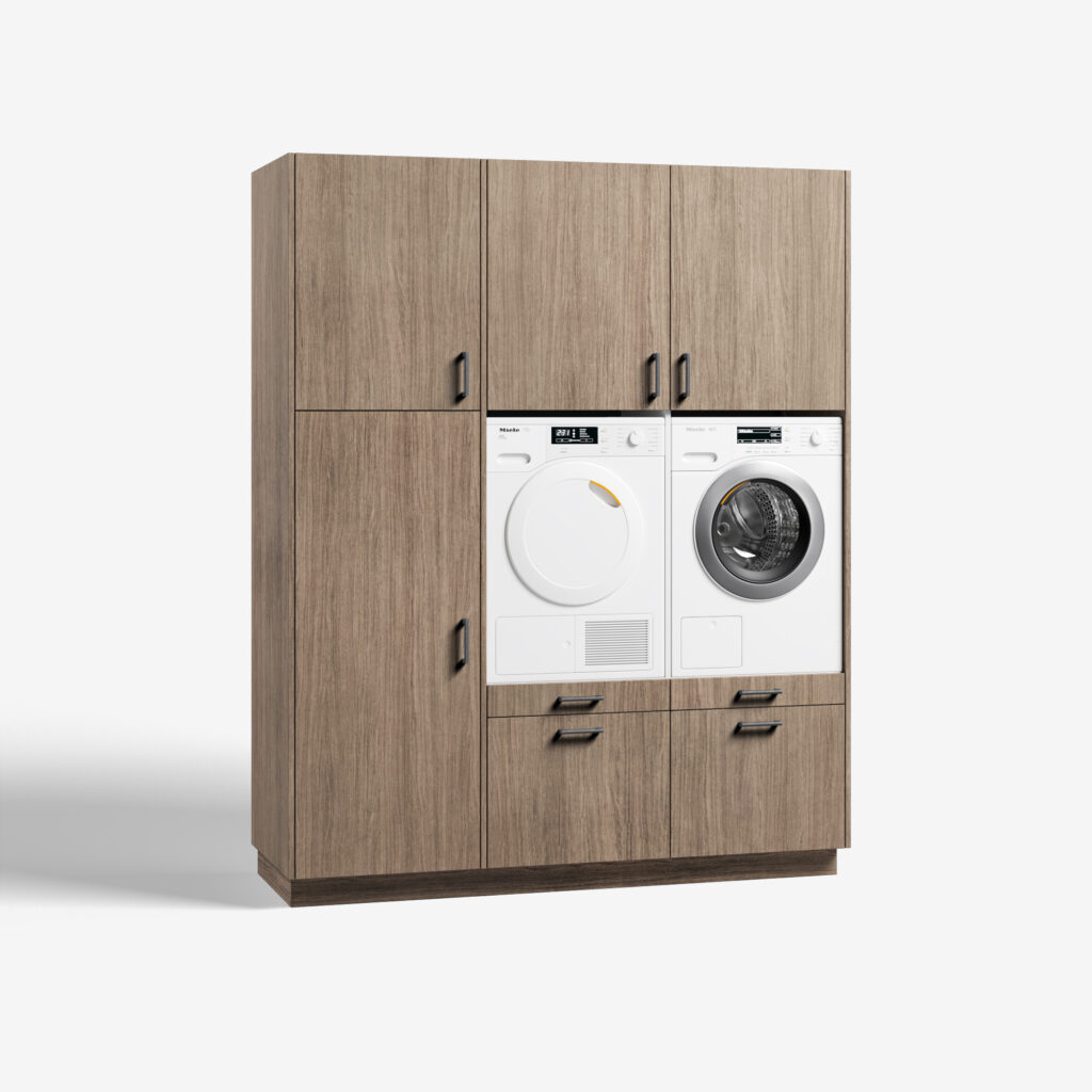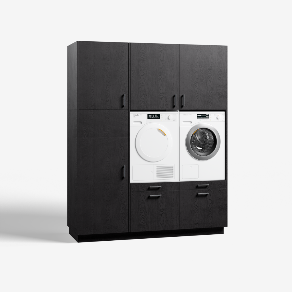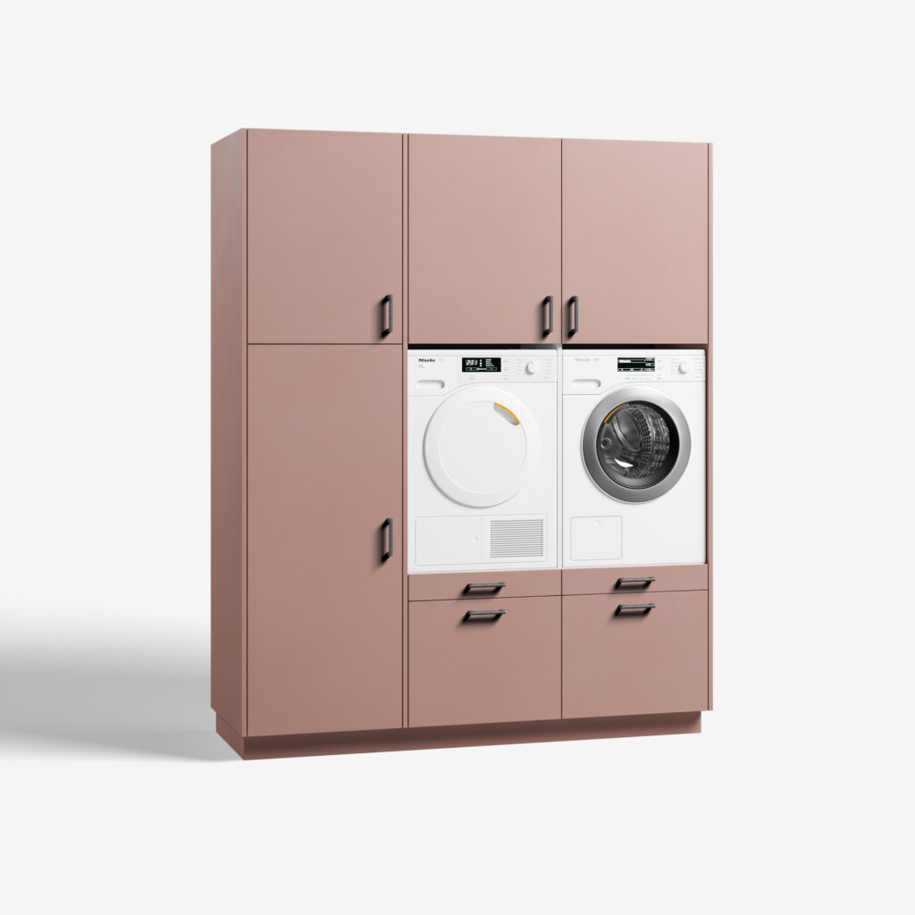 Met het model Three of a Kind win je bijzonder veel ruimte. Ook als de grootte van het vertrek waarin je de wasmachinekast plaats, beperkt is. Met z’n 1,90 meter is de kast geschikt voor op een bescheiden plek. Toch is Three of a Kind groot genoeg voor maar liefst drie apparaten. De kast heeft namelijk twee open ruimtes voor je droog- en wasmachine. Rechts daarvan zit een hoge kast. Gebruik deze als flexibele bergruimte, bezemkast of als plek voor een (extra) koelkast of vriezer. Wat een gemak. De Three of a Kind biedt je drie keuzes: 1) jouw gewenst kleur, 2) jouw eigen stijl handgrepen en 3) koelkast of bergruimte. Ga je voor de koelkast, dan kunnen we je een Liebherr koelkast of Liebherr vriezer leveren. Deze apparatuur bouwen we in en installeren wanneer jij jouw bestelling door de monteurs van wasmachinekast.nl thuis laat plaatsen. Wil je naast de twee ruime soft close lades en de praktische uitrek plateaus de hoge kast als bergruimte benutten? De kast is standaard voorzien van vier verstelbare schappen. De verstelbare poten zetten je wasmachinekast gegarandeerd waterpas en achter de demontabele plint, verdwijnen alle snoeren en aansluitingen keurig uit het zicht. Wasmachinekast.nl biedt op elke wasmachinekast, standaardmodel of maatwerk, vijf jaar volledige garantie. Van je Three of a Kind zijn de kwaliteit en service langdurig gegarandeerd. Kies jij voor zelf monteren, dan wordt je wasmachine meubel in praktische delen aan huis geleverd en zet je het model zelf eenvoudig in elkaar. Kies je voor ‘inclusief montage’ dan bezorgen wij jouw wasmeubel aan huis en monteren onze servicemedewerkers tegen meerprijs de kast op locatie, inclusief installatie van de wasmachine, droger en de Liebherr koelkast of vriezer in de ruime Three of a Kind. Three of a Kind heeft ook een linkshandige opstelling: wasmeubel Big blind.