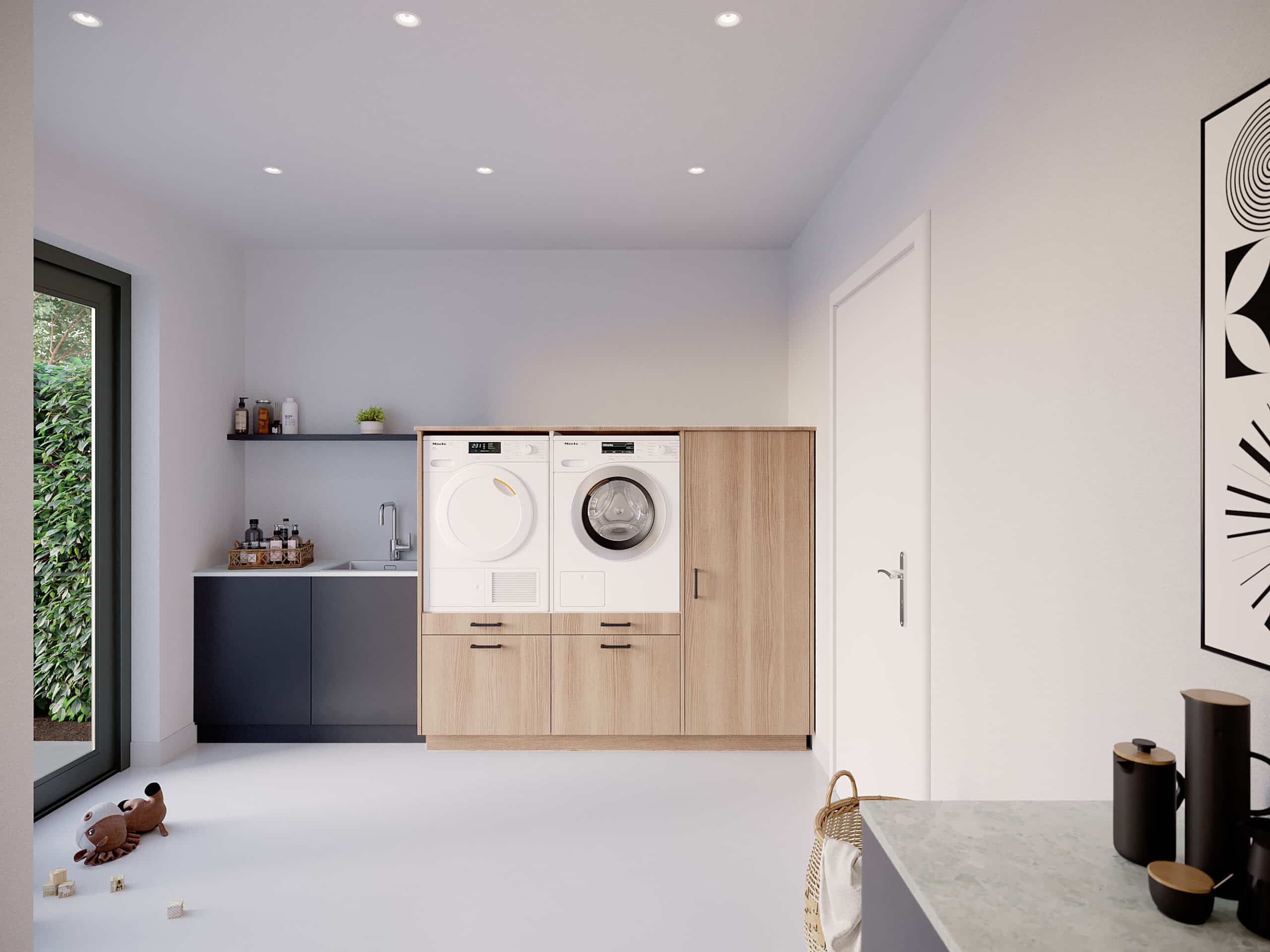 Met het model Three of a Kind win je bijzonder veel ruimte. Ook als de grootte van het vertrek waarin je de wasmachinekast plaats, beperkt is. Met z’n 1,90 meter is de kast geschikt voor op een bescheiden plek. Toch is Three of a Kind groot genoeg voor maar liefst drie apparaten. De kast heeft namelijk twee open ruimtes voor je droog- en wasmachine. Rechts daarvan zit een hoge kast. Gebruik deze als flexibele bergruimte, bezemkast of als plek voor een (extra) koelkast of vriezer. Wat een gemak. De Three of a Kind biedt je drie keuzes: 1) jouw gewenst kleur, 2) jouw eigen stijl handgrepen en 3) koelkast of bergruimte. Ga je voor de koelkast, dan kunnen we je een Liebherr koelkast of Liebherr vriezer leveren. Deze apparatuur bouwen we in en installeren wanneer jij jouw bestelling door de monteurs van wasmachinekast.nl thuis laat plaatsen. Wil je naast de twee ruime soft close lades en de praktische uitrek plateaus de hoge kast als bergruimte benutten? De kast is standaard voorzien van vier verstelbare schappen. De verstelbare poten zetten je wasmachinekast gegarandeerd waterpas en achter de demontabele plint, verdwijnen alle snoeren en aansluitingen keurig uit het zicht. Wasmachinekast.nl biedt op elke wasmachinekast, standaardmodel of maatwerk, vijf jaar volledige garantie. Van je Three of a Kind zijn de kwaliteit en service langdurig gegarandeerd. Kies jij voor zelf monteren, dan wordt je wasmachine meubel in praktische delen aan huis geleverd en zet je het model zelf eenvoudig in elkaar. Kies je voor ‘inclusief montage’ dan bezorgen wij jouw wasmeubel aan huis en monteren onze servicemedewerkers tegen meerprijs de kast op locatie, inclusief installatie van de wasmachine, droger en de Liebherr koelkast of vriezer in de ruime Three of a Kind. Three of a Kind heeft ook een linkshandige opstelling: wasmeubel Big blind.